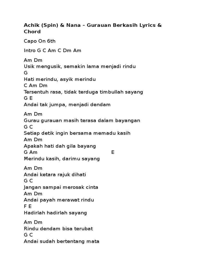 Lalu cinta kita bermula Dari mata turun ke jiwa Dari teman menjadi cinta Dan berjanji. G Kau terkini duduk di carta hati C Am Lalu cinta kita bermula F Dari mata turun ke jiwa G Dari teman menjadi cinta C Dan berjanji untuk setia Am Sehidup semati kita F Menjanjikan bahagia G Untuk kita berdua selamanya C Am F G oh oh oh oh C Am Jangan engkau. Request Chord Services Organizes Chords Collection.